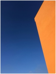 Striking minimalist composition featuring an orange building against a vivid blue sky.