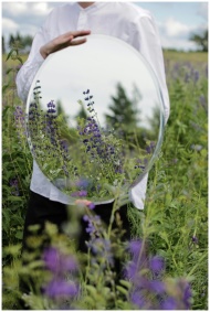 A man holding a round mirror reflecting lupine flowers in a lush field.