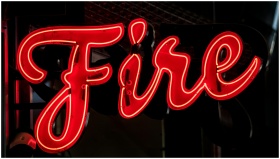 A striking red neon sign spelling 'Fire' in a dark