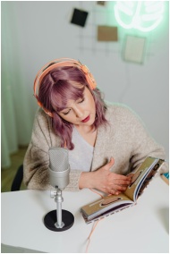 A young woman with purple hair reads a book while listening through headphones at a white desk with a microphone.
