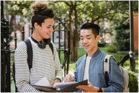 Two young college students engage in a cheerful discussion about their homework on campus.
