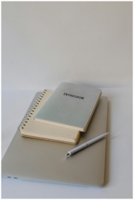 A clean and minimalist office setup with a laptop, notebooks labeled 'enthusiasm', and a pen on a table.