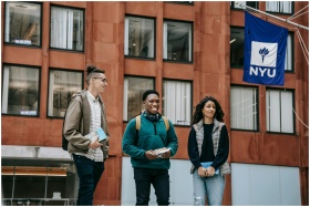 Group of happy multiracial friends with backpacks and notebooks smiling while standing near building and talking