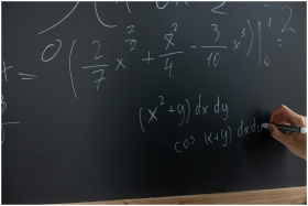 Hand writing mathematical equations on a chalkboar