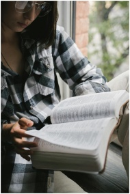 A woman wearing glasses reads an open book by the window, in a plaid shirt. Relaxed indoor setting.