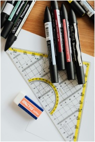 Top view of various markers and plastic drawing tr