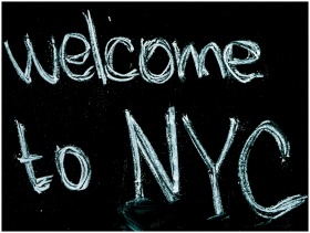 Close-up of a chalkboard with 'Welcome to NYC' han