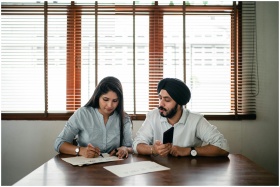 Indian woman with papers and pen writing on paper poster with ethnic Indian man in turban sitting nearby at wooden table