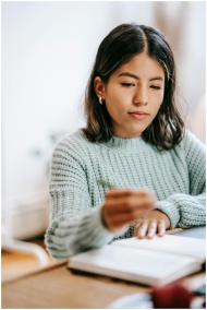 Concentrated young ethnic female with short dark hair writing in notebook while working at table