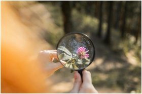 Close-up of a flower magnified by a glass, highlighting nature's beauty.