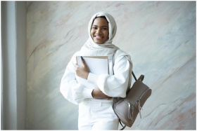 Young Muslim woman in hijab smiling with backpack and clipboard indoors.