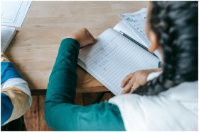 From above crop anonymous schoolgirl in casual clothes sitting at school desk with opened copybook during lesson