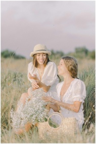 Two women enjoying a sunny day in a serene grass field, smiling and relaxed.