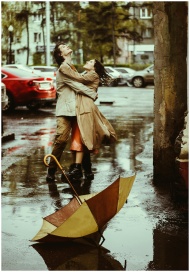 Couple hugging under rain with an umbrella down on