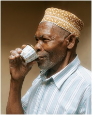 An elderly man savoring tea in traditional attire in Zanzibar, Tanzania.