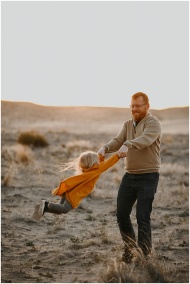 A joyful father spins his daughter in a sunny desert landscape, capturing a playful and happy moment.