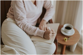 A person journaling in a cozy room with a cup of c