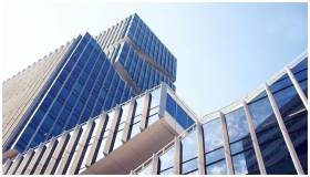 Low-angle shot of a modern skyscraper with reflective glass design under a clear blue sky.
