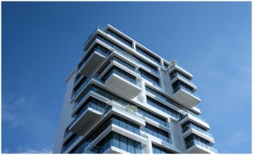 Striking low-angle shot of a modern condominium with unique balcony design and clear blue sky.