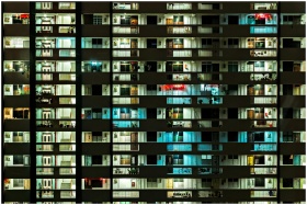 Night view of a modern apartment building with illuminated windows, showcasing urban life.
