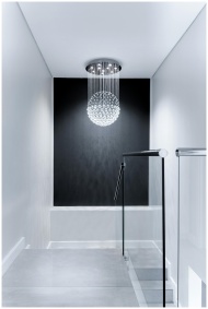 Sleek contemporary hallway featuring a stunning glass chandelier and minimalist design.