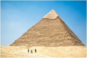 Iconic Giza Pyramid with riders on camels under bright daylight, capturing Egyptian desert landscapes.