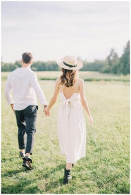 Couple walking hand in hand through a sunlit field