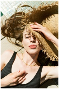 A woman relaxes outdoors with a straw hat, embracing the summer sun.