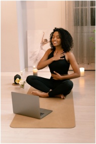 African American woman practicing yoga and meditation indoors with a laptop.