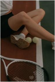 A tennis player seated on a court, with tennis balls and racket nearby.