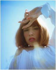 Artistic portrait of a woman with bob haircut shielding her eyes from the sun.