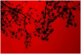 Silhouette of tree branches against a vivid red ba