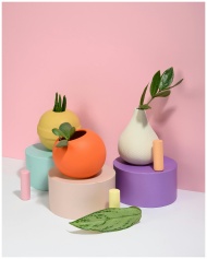 Vibrant succulents in colorful geometric pots on p