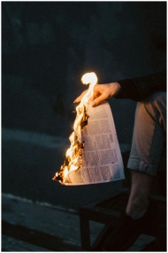 A close-up view of a newspaper set ablaze, held by an adult hand, showcasing fire's intensity at night.