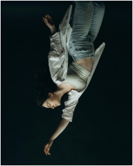 Striking upside down portrait of a woman on a dark background conveying artistic expression.