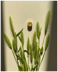 Close-up of green barley stalks lit by sunlight, casting shadows on a minimalist wall.