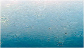 Close-up of raindrops creating ripples on a calm water surface.