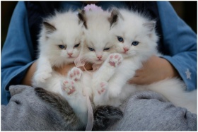 Three fluffy ragdoll kittens with blue eyes being held gently, showcasing their cuteness.