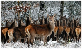 A group of red deer standing gracefully in a snowy woodland, capturing a serene winter scene.