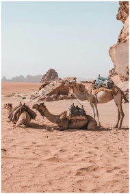 Camels resting in the sandy Wadi Rum desert, showcasing Jordan's arid beauty and outdoor adventure.