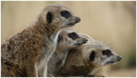 Trio of meerkats attentively watching their surroundings in a natural habitat.
