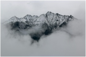 A breathtaking view of snow-covered mountain peaks surrounded by dense fog, creating a mystical landscape.