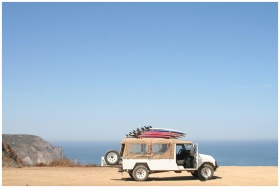 A jeep loaded with surfboards parked by a scenic ocean cliff under a clear sky.