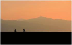 Cyclists on a road at dusk with mountains silhouetted against a vibrant orange sky.