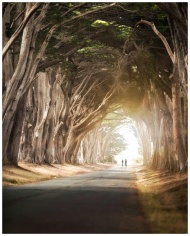 A serene road flanked by towering trees forming a natural tunnel. Two people walk into the light.