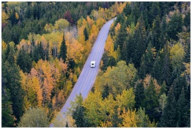 A campervan travels on a winding road through vibrant autumn forest scenery.