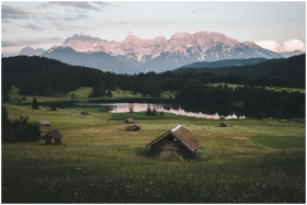 Explore the serene Bavarian landscape in Krün, Germany, with lush fields, a tranquil lake, and majestic mountains at dawn.