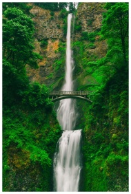 Captivating waterfall cascading through lush greenery and a scenic bridge.