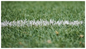 Detailed close-up of a white line on artificial green turf, perfect for sports backgrounds.