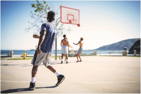 People playing basketball on an outdoor court with a scenic view at Avila Beach.